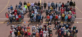 1) Photographie de tous les élèves dans la cour de l’école (avec les masques) : Cliquez sur l’image pour l’agrandir. 2) Photographie de tous les élèves dans la cour de l’école (avec les masques et les bras levés) : Cliquez sur l’image pour l’agrandir.